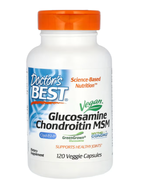 Doctor's Best Vegan Glucosamine Chondroitin MSM (GCMSM) contains three ingredients known to support healthy joints and joint function: glucosamine, chondroitin and MSM (methylsulfonylmethane). This unique combination uses GreenGrown® 100% vegetable source glucosamine sulfate, highest purity OptiMSM®, and Mythocondro®, the first formulation to contain non-animal chondroitin sulfate. Non-animal derived chondroitin provides greater concentration and 43% higher absorption than chondroitin sulfate of animal origin.