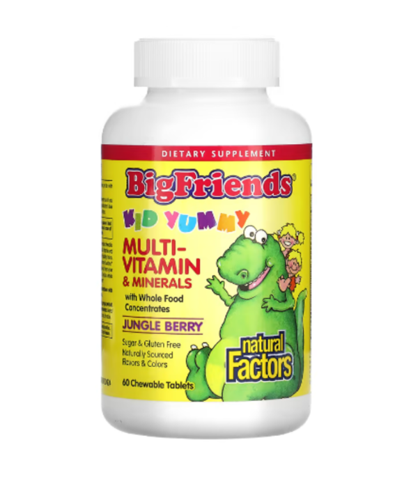 BigFriends Chewable Multivitamin is "certified" kid yummy! This comprehensive chewable multivitamin and mineral formula provides your child with all the essential vitamins and minerals for good health, including the development and maintenance of healthy bones, teeth, gums, eyesight, night vision, healthy skin, membranes, and immune function. Sweetened with xylitol and stevia, healthy sugar-free alternatives that won't harm your child's eth and come in cute dinosaur shapes your kids will love to eat! Includes whole food concentrates, many of which are sourced from Natural Factors Farms.